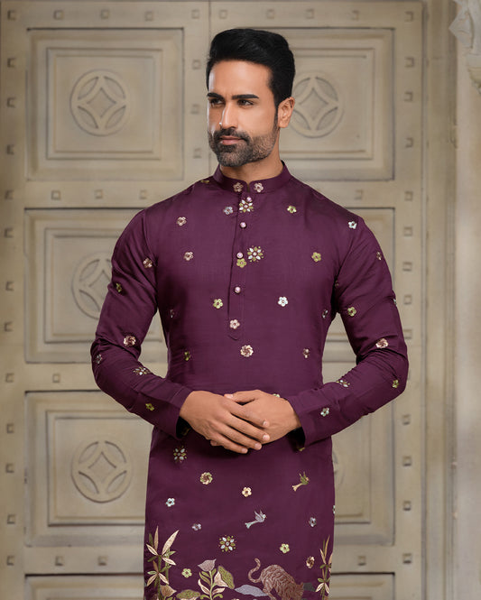 Dark Wine Silk Kurta with Intricate Motif Embroidery