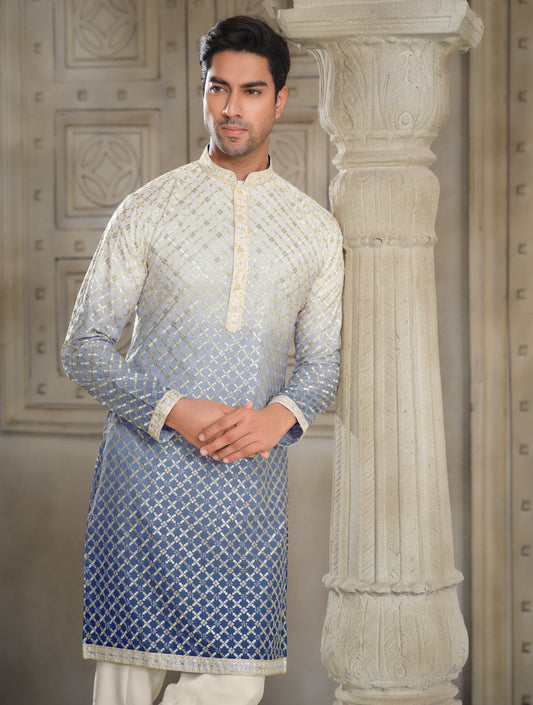 Celestial Harmony Silk Kurta - White & Blue with Multi-Color Embroidery