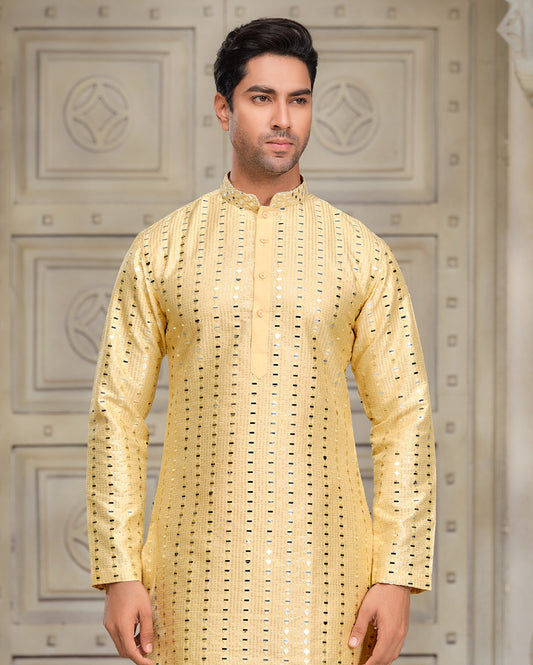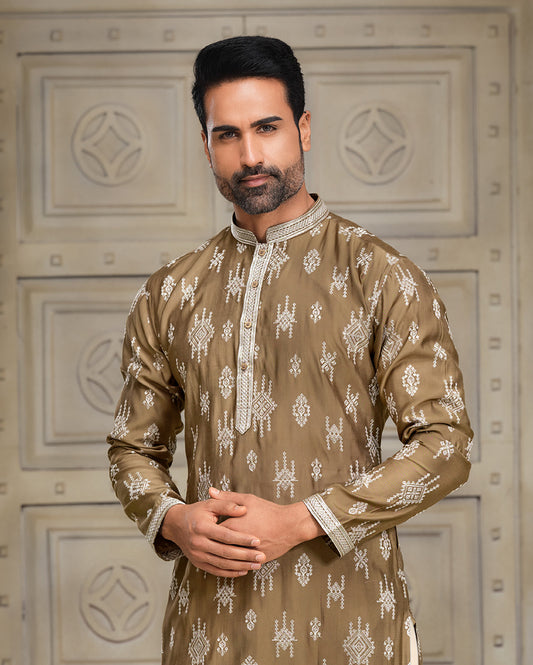 Wild Wheat & Sunken Gold Silk Kurta with Golden Embroidery