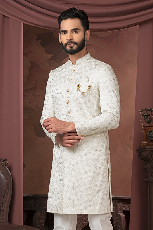 Ivory White Embroidered Indo-Western Sherwani with Chain Detail
