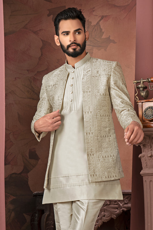 Ivory Printed Embroidered Indo-Western Sherwani Set