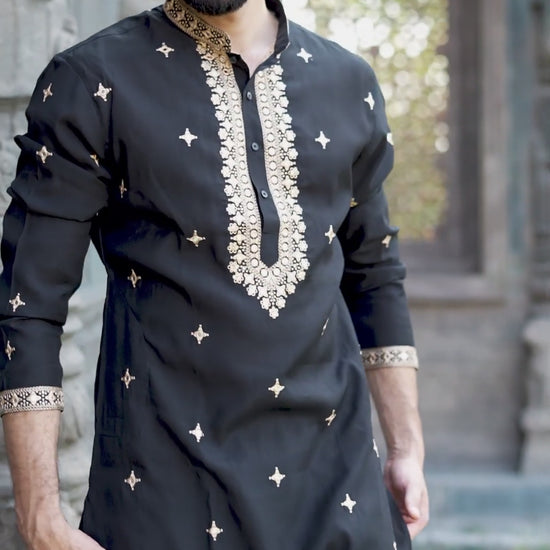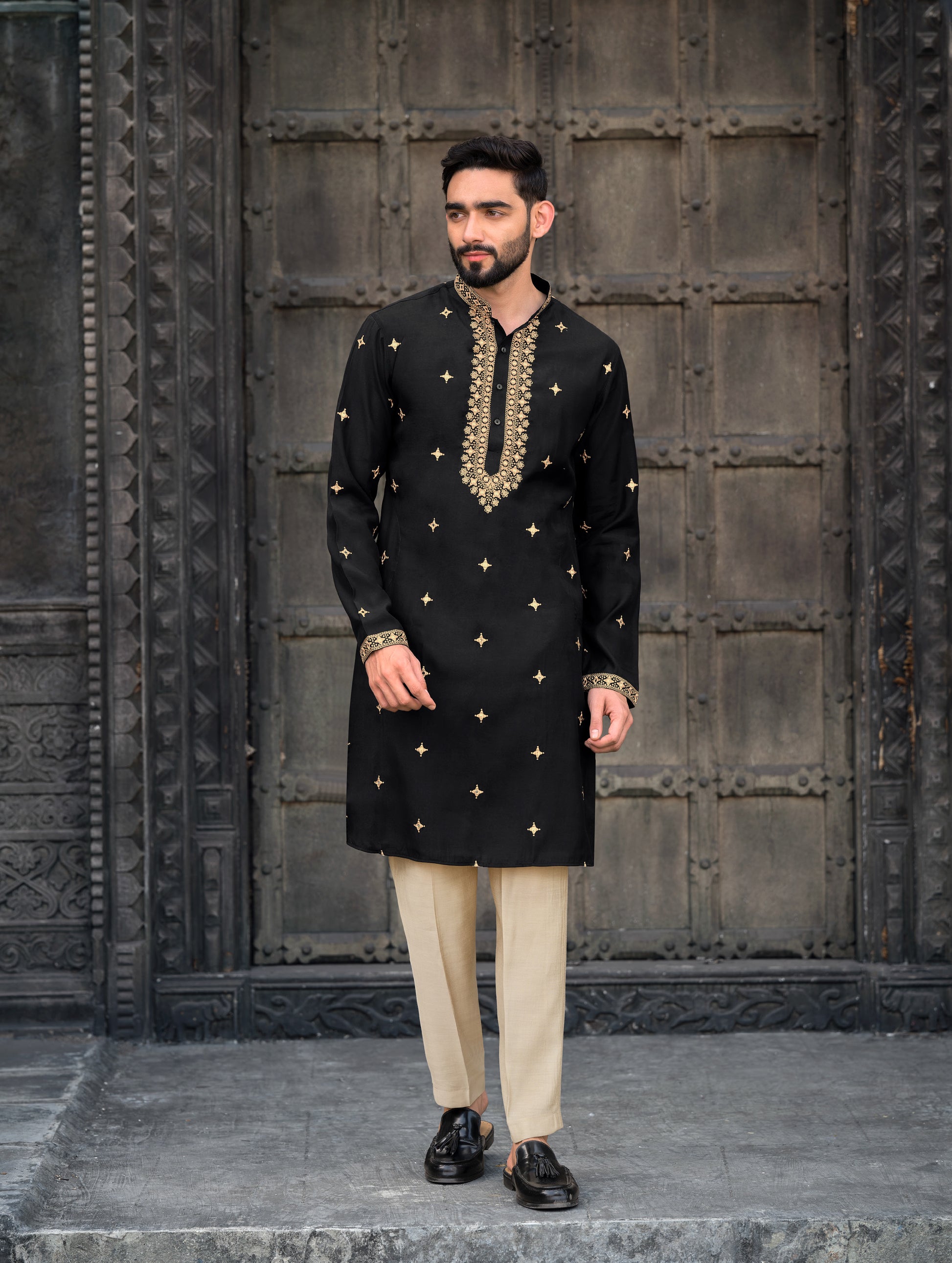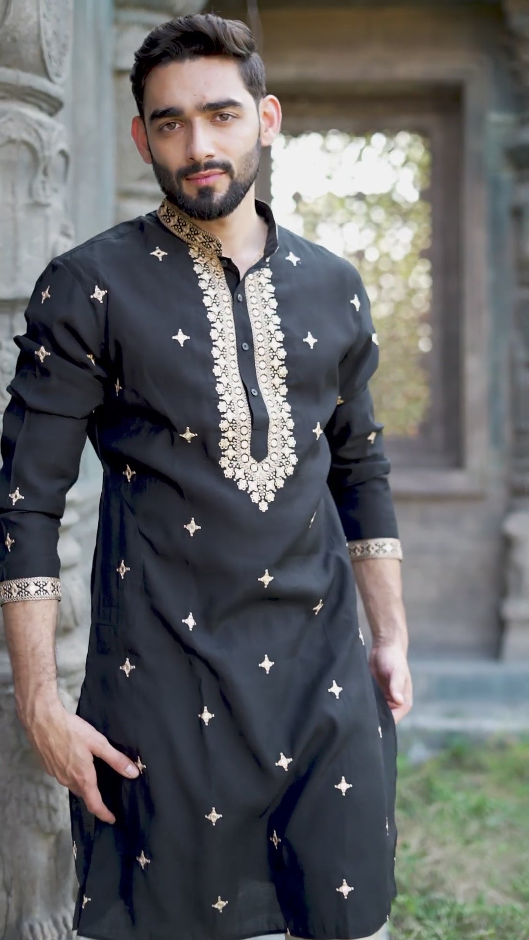 Why You'll Love It: This Black Silk Kurta with Gold Embroidery is a true symbol of elegance. The luxurious silk fabric combined with the opulent gold detailing creates a look that is both sophisticated and timeless. Whether you're attending a wedding, a festive celebration, or any special occasion, this kurta ensures you stand out with unmatched style and grace.