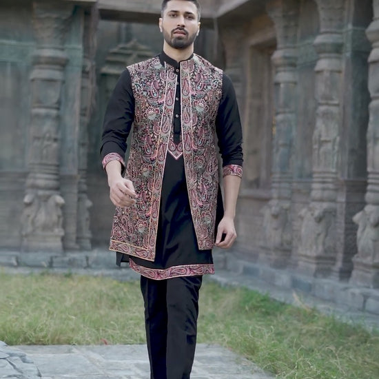 Discover the epitome of elegance with our Classic Black Silk Koti Kurta Set, meticulously designed to elevate your traditional wardrobe. This sophisticated ensemble features a timeless black kurta, paired with a luxurious silk koti adorned with exquisite multi-color embroidery. The intricate embroidery work adds a vibrant touch, making it a perfect choice for weddings, festive celebrations, and special occasions.