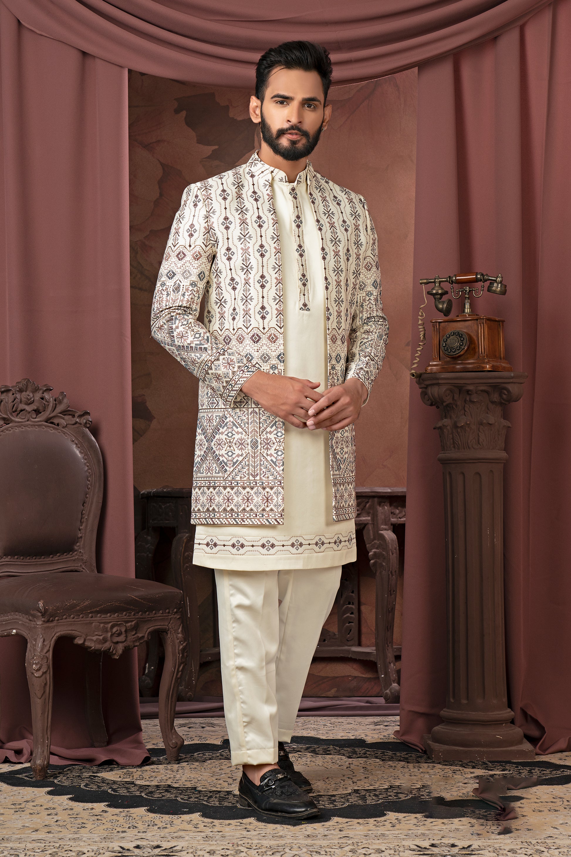 - *Contemporary Open Design:* The open-front style gives a modern edge to this traditional sherwani, ensuring you stand out in the crowd.