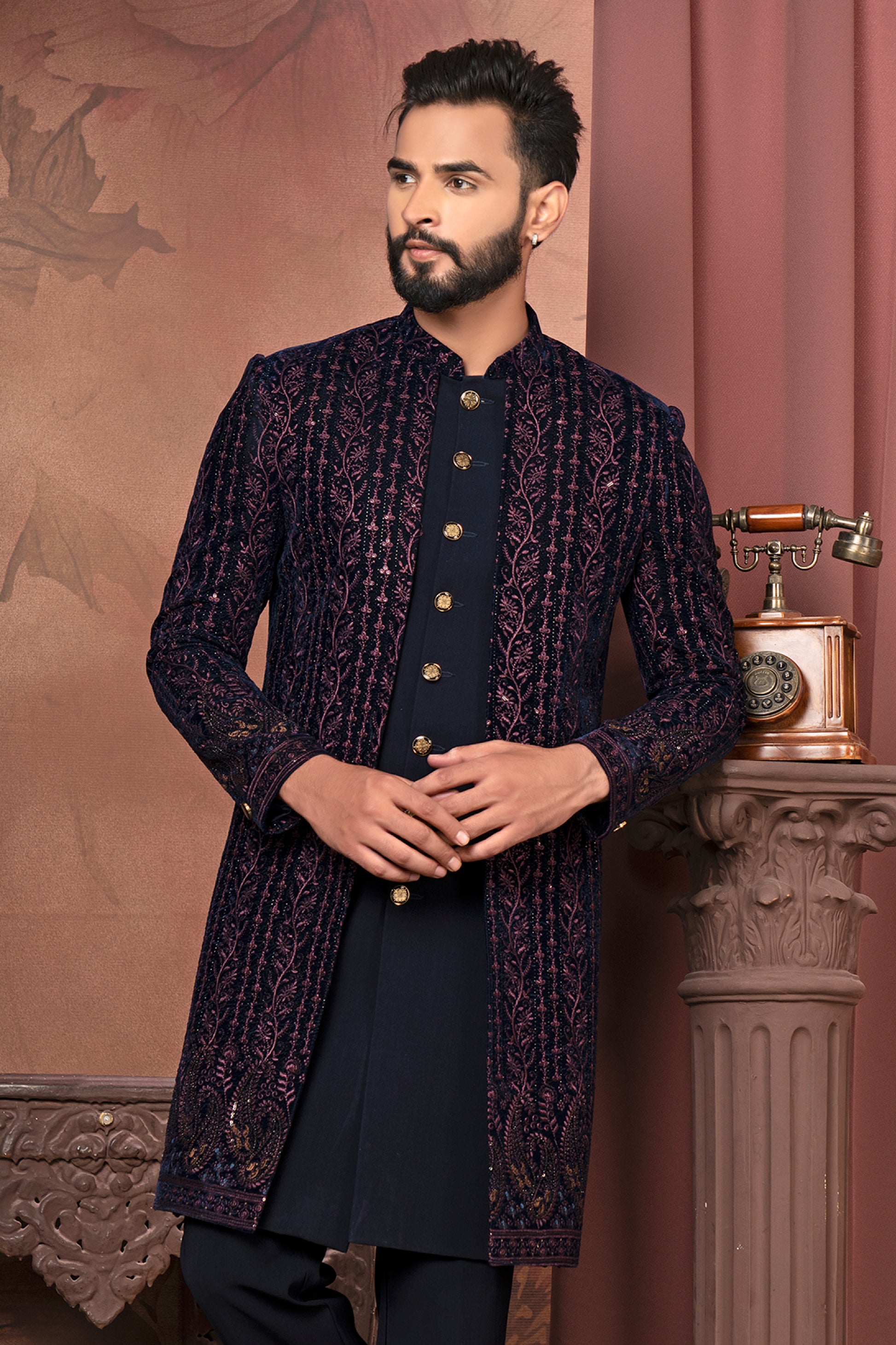 Paired with a matching kurta and trousers, this ensemble offers a complete look that is both stylish and comfortable. The golden buttons add a touch of classic charm, while the tailored fit ensures a flattering silhouette. Whether you're the groom, a guest, or simply seeking to make a statement, this Koti Kurta set is your go-to choice for timeless elegance.