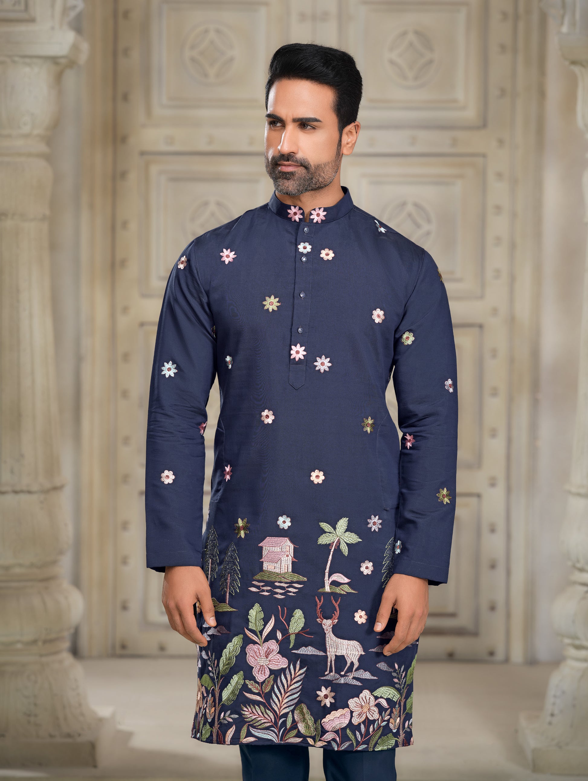 Elevate your traditional wardrobe with this exquisite Navy Blue Embroidered Silk Kurta, a perfect blend of elegance and craftsmanship. Made from luxurious silk, this kurta features intricate floral and nature-inspired embroidery, showcasing scenes of serene landscapes with deer, palm trees, and delicate flowers. The rich navy blue color serves as the perfect backdrop for the vibrant embroidery, making this kurta a statement piece for any festive or special occasion.