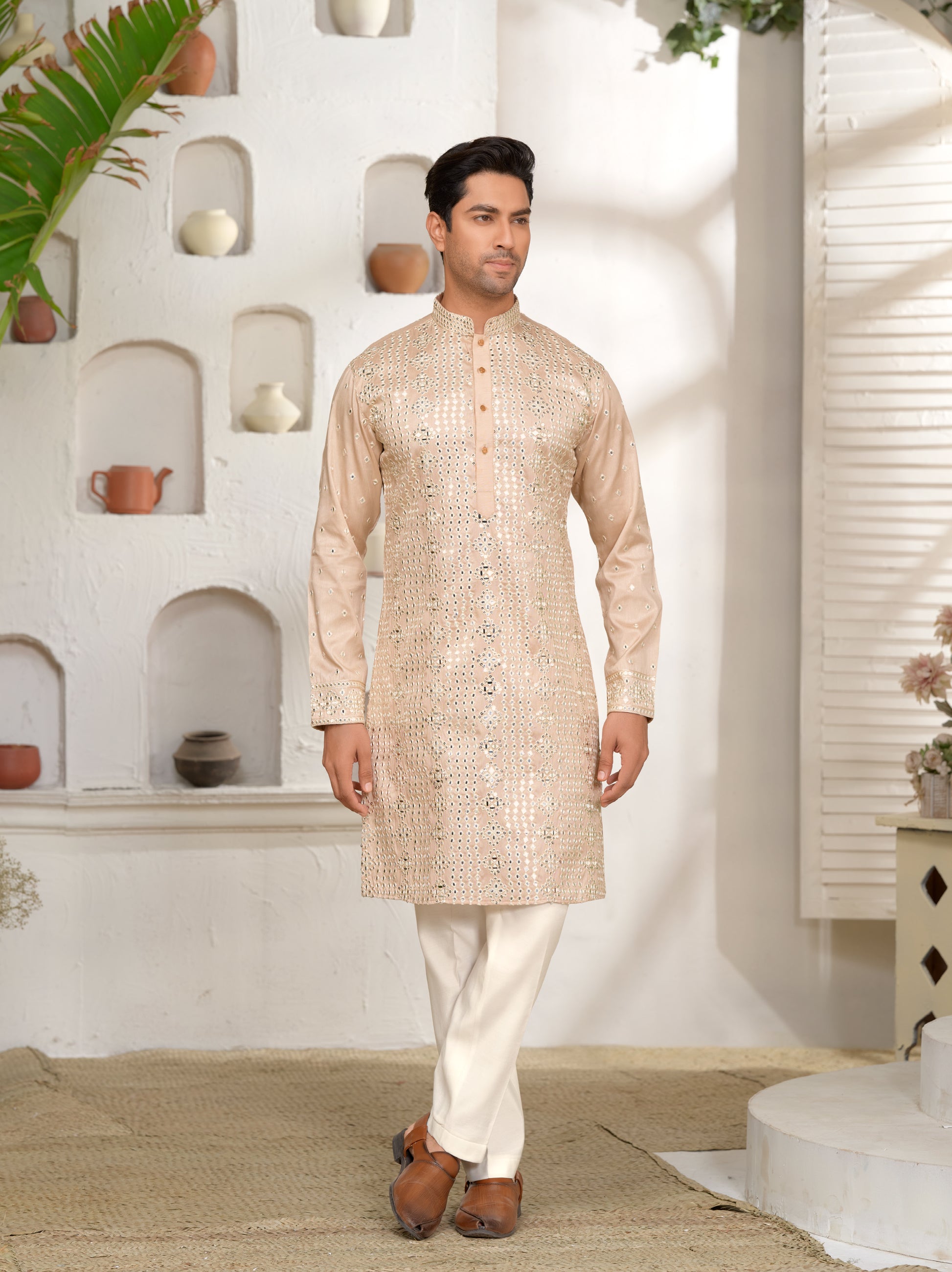 Description: Indulge in luxury with the Rose Gold Silk Kurta Set, a perfect blend of elegance and glamour. Crafted from rich silk, this set is adorned with exquisite mirror work that adds a touch of sparkle to the soft rose gold hue. Ideal for festive occasions and special celebrations, this kurta set promises to make a dazzling impression.