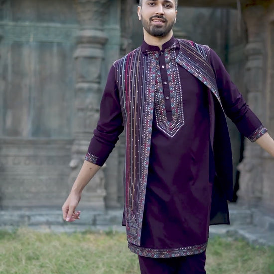 Embrace the epitome of elegance with our Royal Purple Silk Koti Kurta Set, designed to make a grand statement. This magnificent ensemble features a rich purple kurta, paired with a luxurious silk koti adorned with intricate multi-color embroidery. The exquisite craftsmanship and vibrant embroidery work add a regal touch, making it an ideal choice for weddings, festive occasions, and grand celebrations.