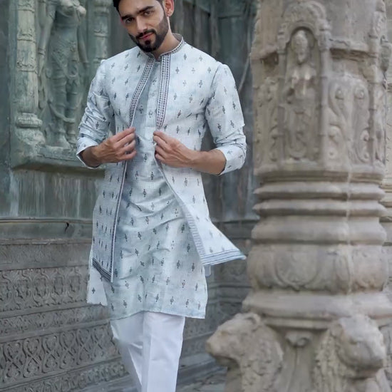 Step up your ethnic wear game with our Sky Blue Silk Koti Kurta Set, featuring exquisite embroidered work that exudes elegance and sophistication. This stunning set includes a beautifully crafted kurta and a complementary koti, making it perfect for any special occasion.