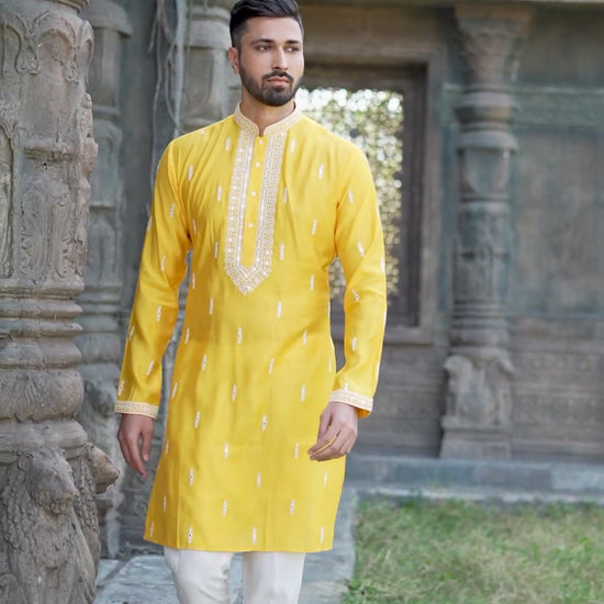 Why You'll Love It: This Yellow Silk Kurta is designed to make you shine. The vibrant color combined with detailed embroidery creates a stunning look that is sure to turn heads. Whether you're attending a wedding, a festival, or any special event, this kurta will make you stand out with its radiant appeal.