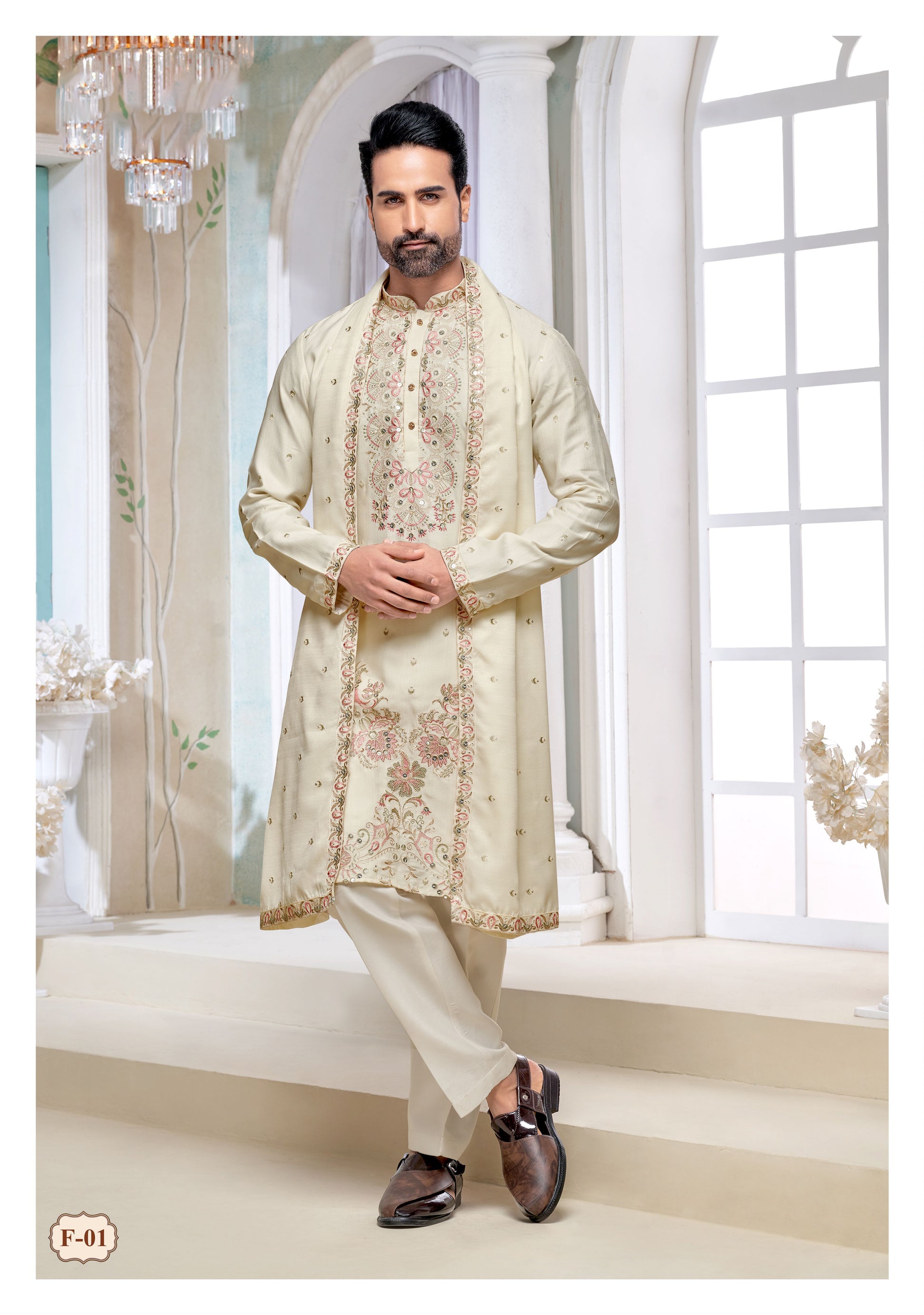 Step into the spotlight with this exquisitely crafted Ivory Silk Designer Kurta, a true masterpiece for the discerning gentleman. Inspired by classic regal attire, this full-length Kurta features a rich, luxurious silk texture that drapes flawlessly.