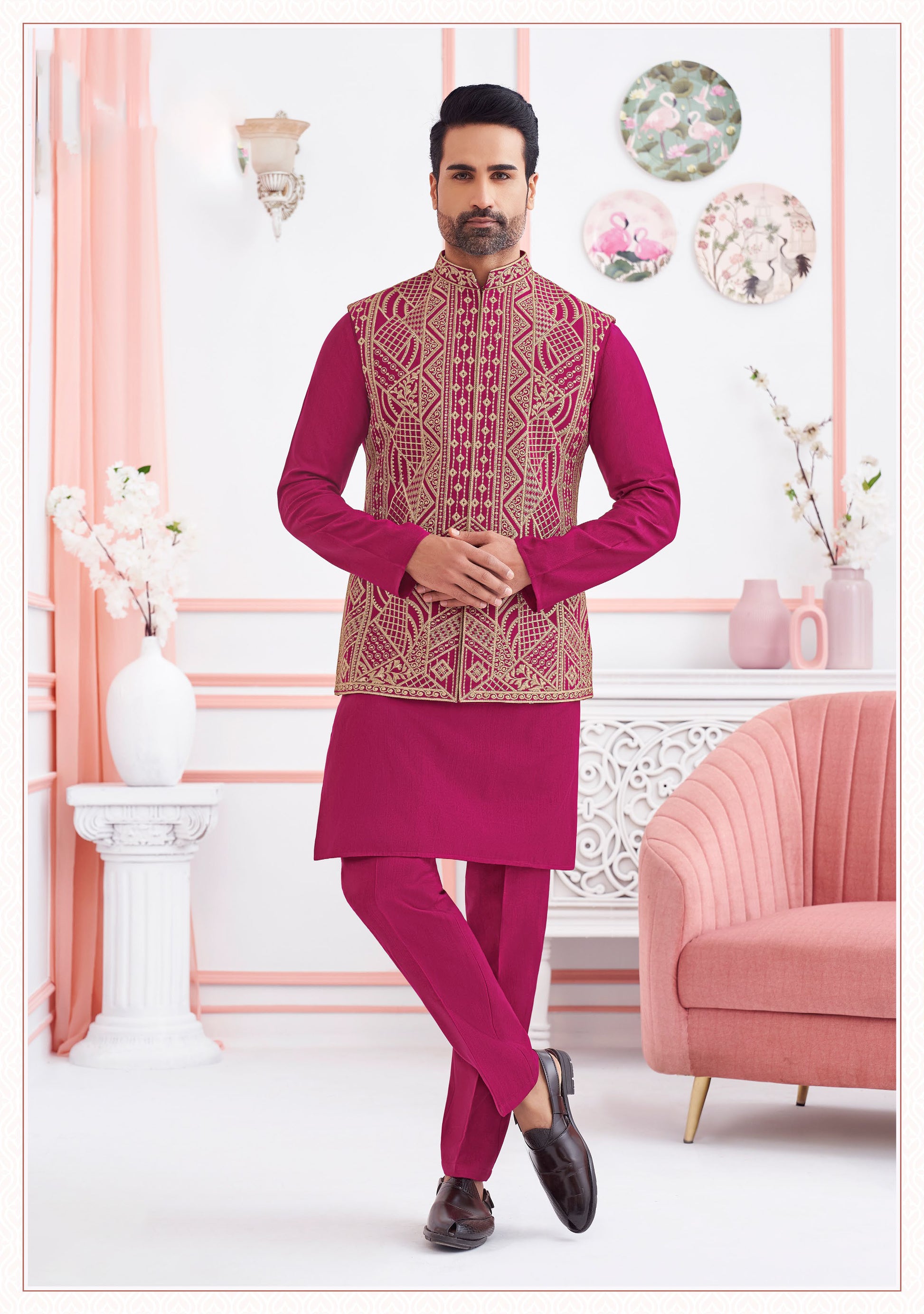 Illuminate your wardrobe with the Vivacious Radiance Golden Embroidered Silk Koti Kurta Set. Crafted from luxurious silk, this set features a kurta and a koti in a striking vivacious hue, embellished with intricate golden embroidery that adds a touch of grandeur. The rich texture and vibrant color make this ensemble an ideal choice for weddings, festive occasions, and cultural celebrations, ensuring you stand out with elegance and style.